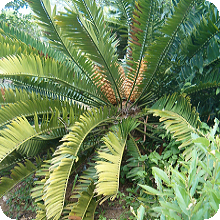 It is an evergreen quick-growing cycad, up to 6.5 m high and with a stem or trunk of about 0.4 m in diameter. The stem sometimes branches, but reclines only when other stems emerge from the base. It has a golden, woolly crown, which increases on production of cones or new whorls of leaves. The leaves are of medium size, about 1.5-3 m long and slightly curved or straight. The leaflets are about 160-230 x 25-45 mm, dark green and entire or with 1-5 teeth on one or both margins. The lower leaflets are reduced to spines. New leaves and cones are covered with yellowish brown wool. There are separate male and female plants; both genders produce 2 or 3 orangy-yellow to orangy-red cones.